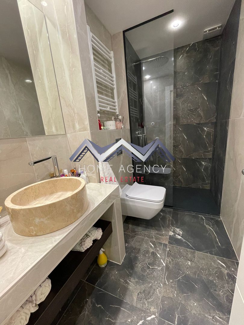 Beneficiază de mobilier și de finisaje premium (parchet triplu stratificat Bauwerk, gresie porțelanată de dimensiuni mari Porcelanosa, obiecte sanitare din porțelan vitrificat alb Roca Meridian, baterii sanitare Grohe Eurocube și uși interioare solide din MDF).