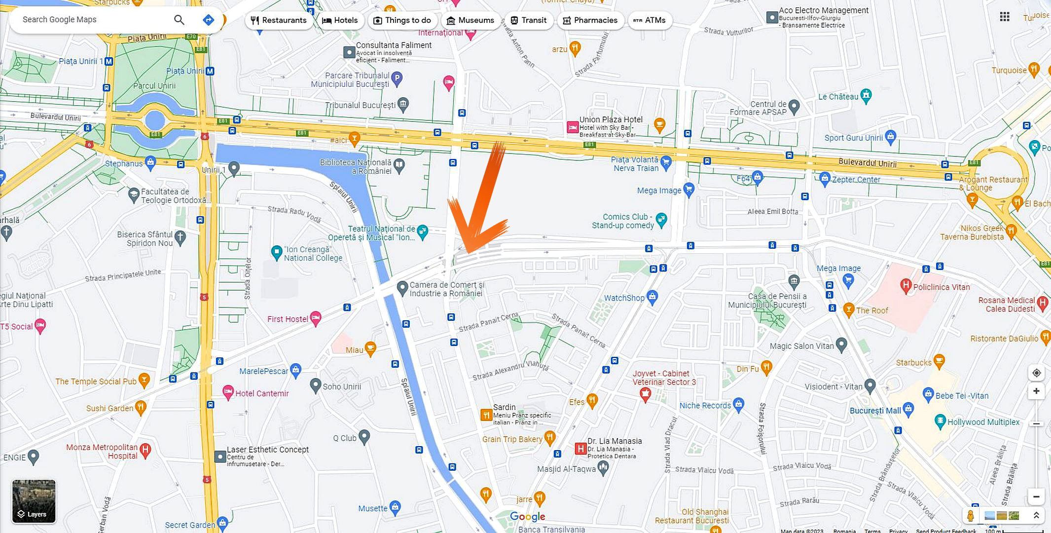 zona: Unirii, bd. Octavian Goga, Camera de Comert (CCIR), Biblioteca Nationala (BN), Teatrul National de Opereta, Tribunalul Bucuresti
