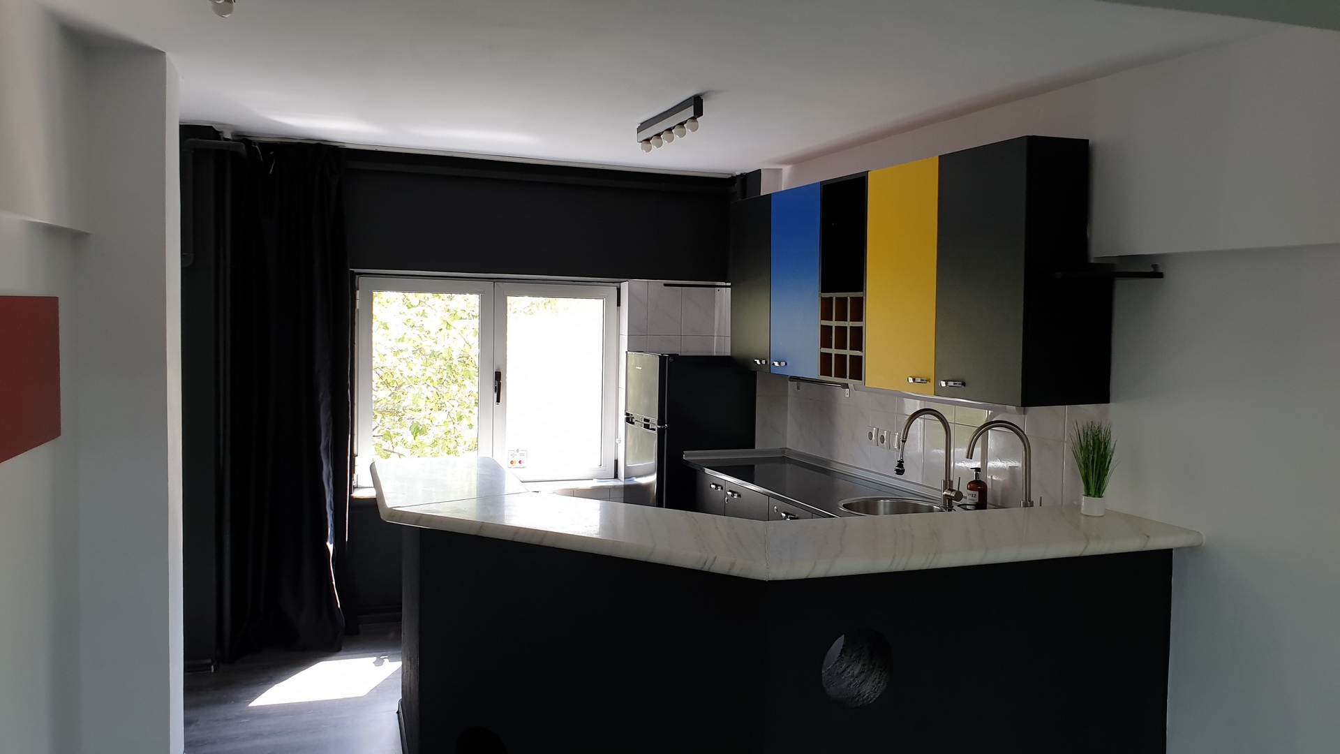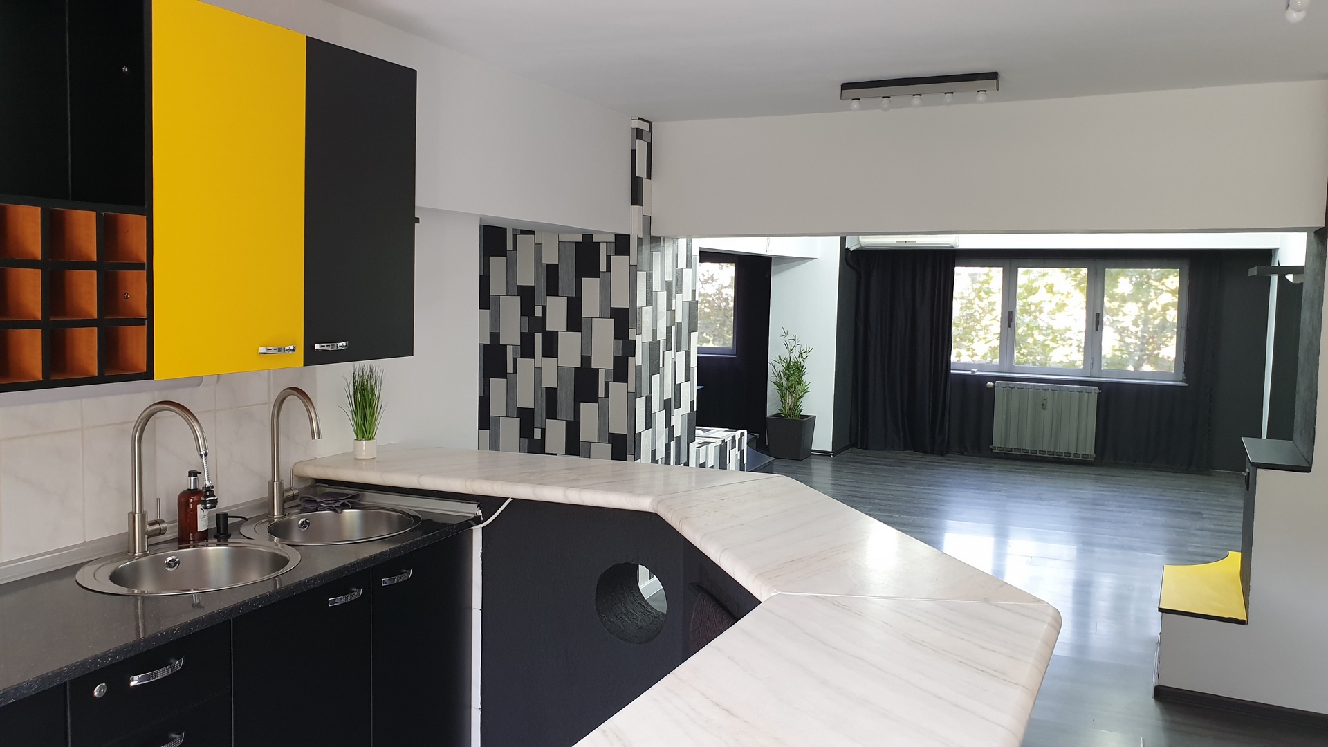 Apartament 3 camere (85mp), remodelat cu spatii largi deschise (open space concept) cu finisaje moderne, semi-mobilat, bucatarie deschisa, partial utilata, cu un bar mare de marmur?, aer conditionat.